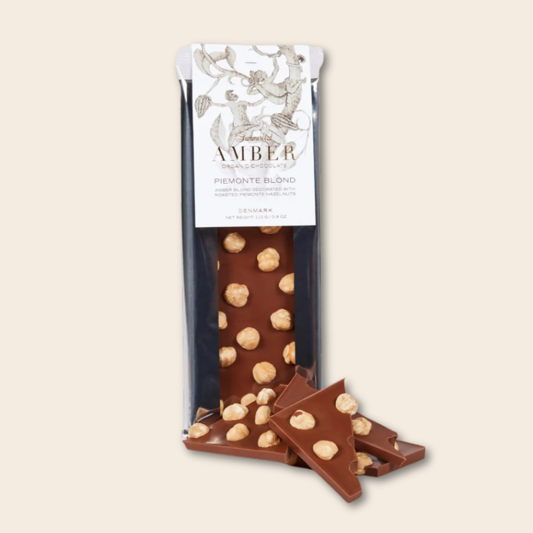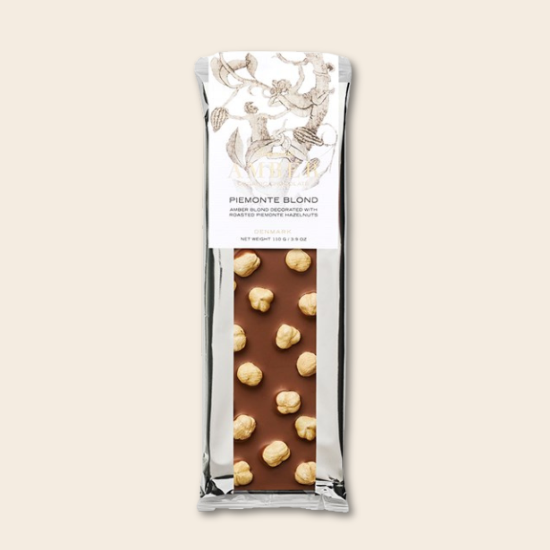 Her møder den bløde, karamelliserede Amber Blond-chokolade de fineste let ristede, økologiske Piemonte-hasselnødder. Kombinationen giver en rund og harmonisk smagsoplevelse, hvor søde toner af frisk mælk, karamel og vanilje balanceres af nøddernes karakteristiske dybe umami og sprøde bid.