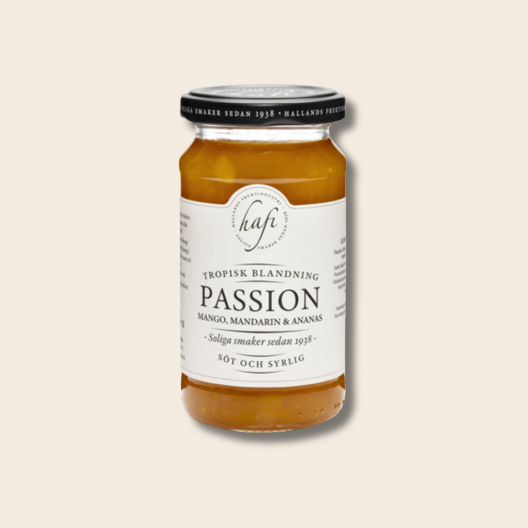 Denne frugtkompot er lavet på en blanding af passion, mango, mandarin og ananas og har en mild sødme og friskhed, der gør den velegnet til både morgenmad, desserter og bagværk. Den kan nemt røres i yoghurt eller skyr og er også god som topping på havregrød. Mange bruger den som et alternativ til marmelade på brød, croissanter eller knækbrød.