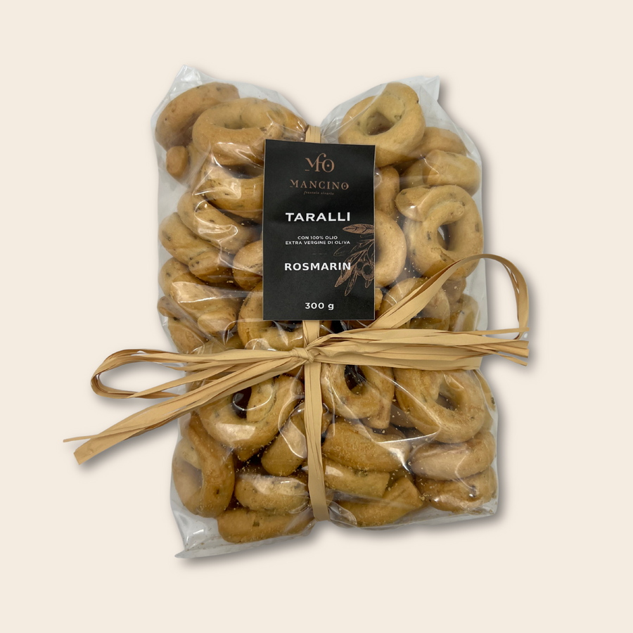 Smagen af Italien i hver eneste bid. Disse håndlavede Taralli med rosmarin er en uimodståelig italiensk specialitet fra Puglia – bagt med ekstra jomfruolivenolie og smagt til med aromatisk rosmarin. Den sprøde konsistens og den rene smag gør dem perfekte som snack, aperitivo eller til tapasbordet.