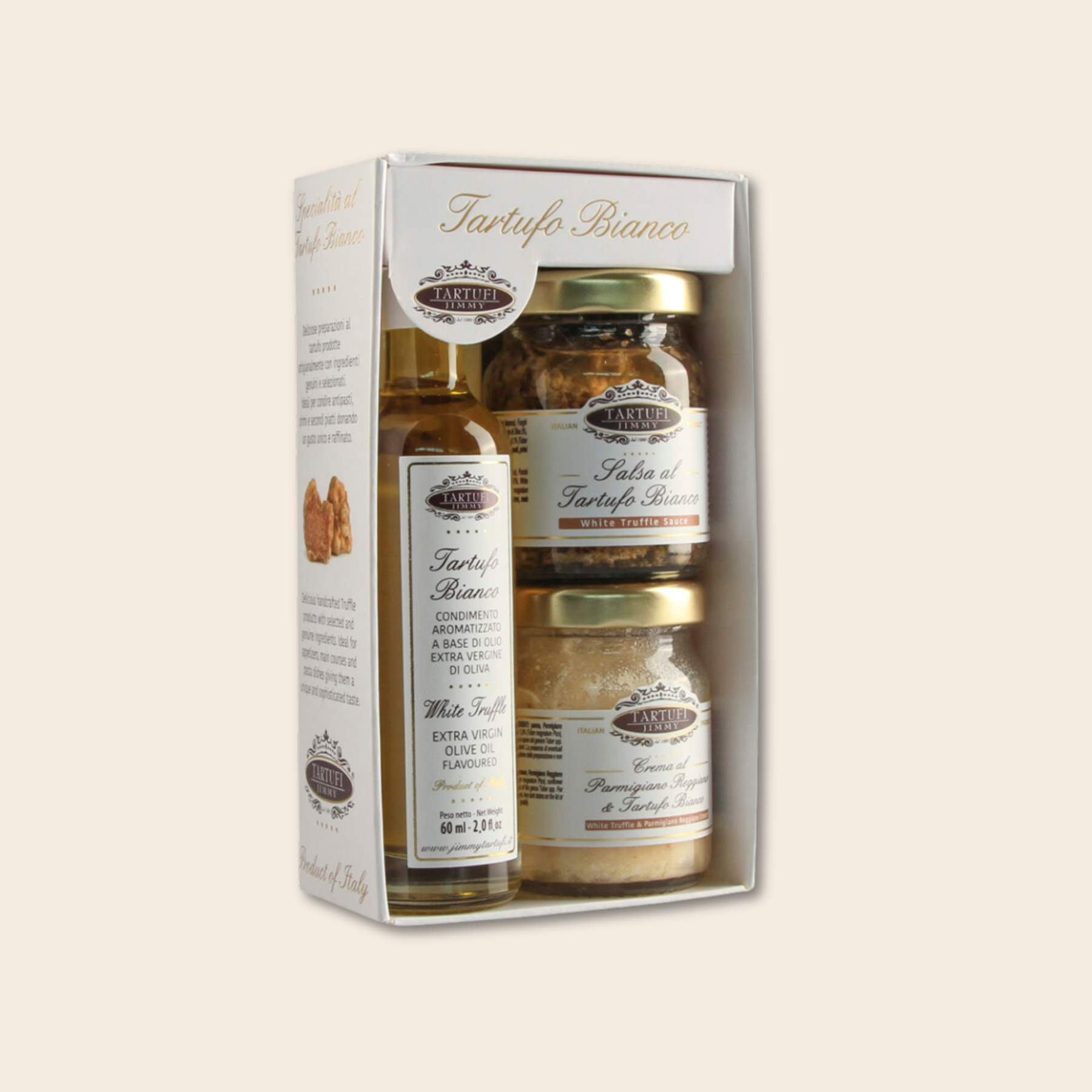 • Gourmet gavesæt med hvid trøffel (hvid trøffelolie, hvid trøffelsalsa og hvid trøffelcreme)